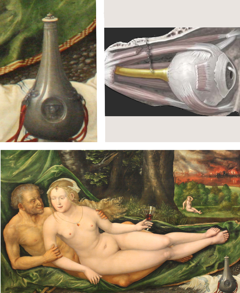 Alcohol is used literally and metaphorically in multiple ways. In art of this kind intoxication often conveys imagination while alcohol in a glass represents a paint-pot. That makes the girl an "artist" too. Emphasizing its location in the mind, the shape of the flask (top left), "outside" the scene in the lower right corner (bottom), suggests an eyeball with its optic nerve, another common motif (top right). If so, the loose red straps may be substitutions for the red ocular muscles now disconnected.{ref1) (In the medical diagram they are shown pleasingly pink.)