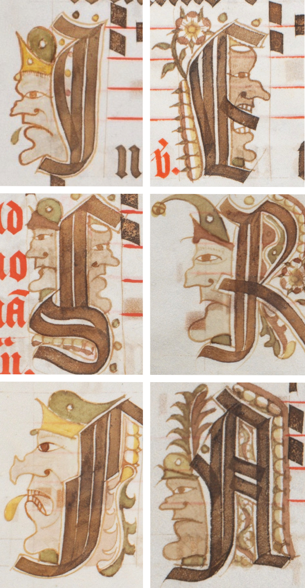 Assorted initials with caricatured faces in the Antiphonarium lausannense vol. IV from (top left, clockwise) ff. 11r, 34v, 17v, 34r, 14r, 18v.