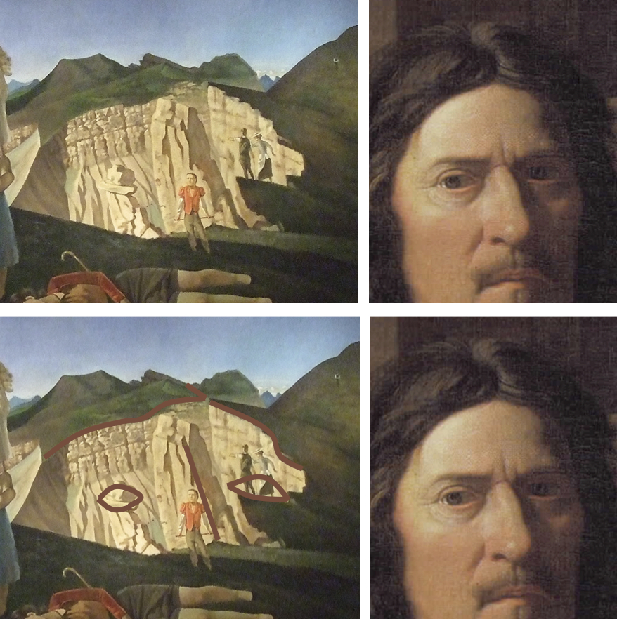 Bottom L&R: Diagram of Balthus' The Mountain; Detail of Poussin's Self-Portrait