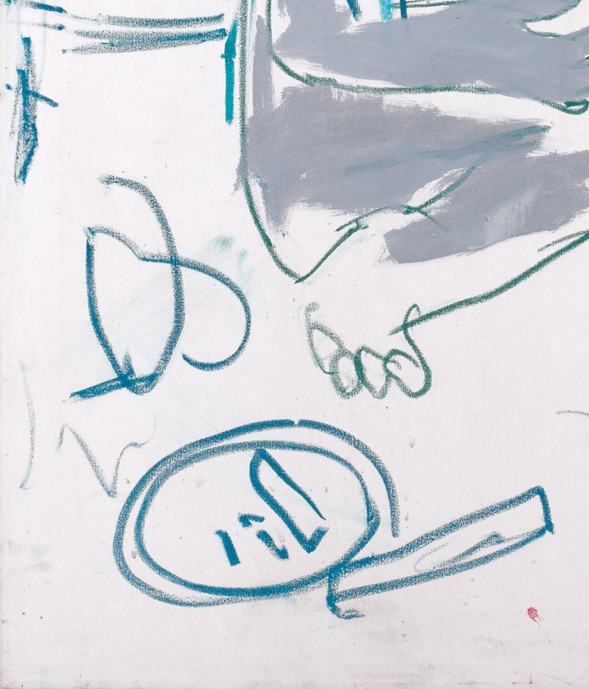 In the foreground lies a long, rectangular shape easily confused with a cigarette but more likely to represent an oilstick, one of the implements used to create the image and its own shape. Next to it lies a circle, perhaps a tray, on which lies yet another oilstick and some associated tools. It is Basquiat's modern equivalent to the circular- or oval-shaped palettes of earlier art. Together, the stick and tray reference the actual artist in the studio but in also forming the letter P may additionally refer to Picasso or another creative figure whose name begins with P and who inspired Basquiat.