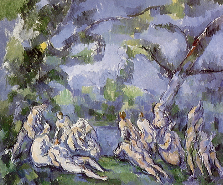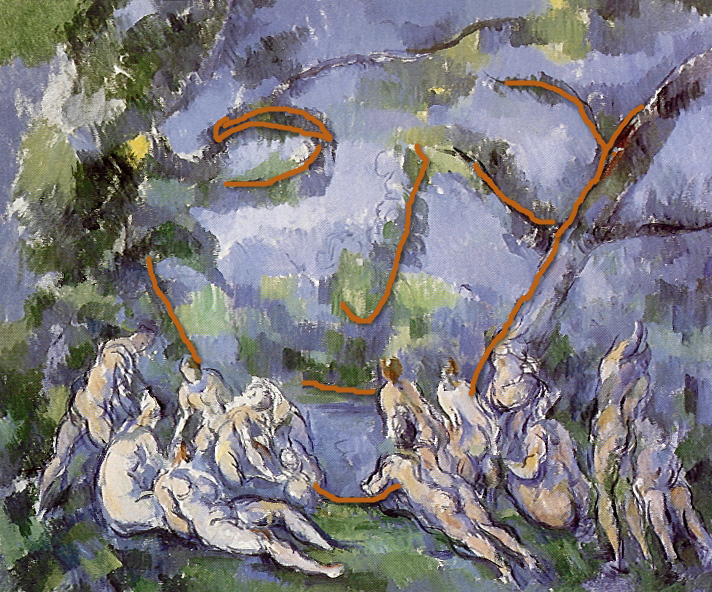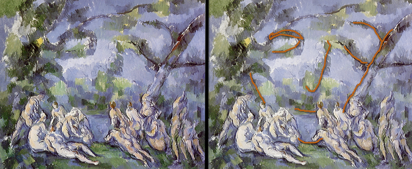 The diagram at right helps reveal the true scene, a double image. This also helps explains why Cézanne's bathers are so un-naturalistic, their clunky bodies looking little like reality. He, like almost all other true artists, did not intend them as real bathers but as figures in his mind.