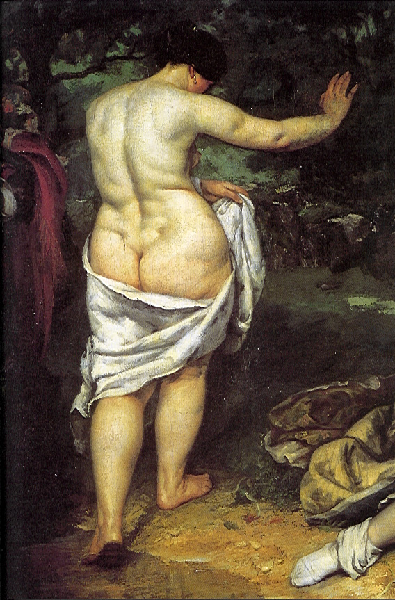 The other woman holding a branch is even more mysterious and will be explained at a later time once the ideas presented on this site are more broadly accepted. The novelty of this painting is that Courbet made even less attempt than earlier artists to hide his underlying meaning with a logical, or almost logical, scene on the surface. The ordinary spectator is left wondering, a prospect for future art that greatly upset Delacroix.