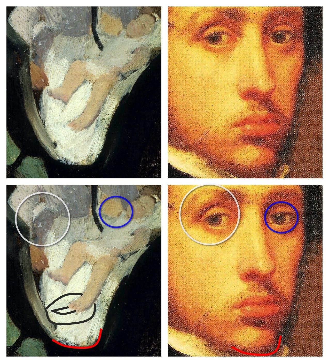 Fragmented portraits are so little known that many may have trouble seeing Degas' distorted "face" appear in the doorway of the carriage.{ref5} Follow the diagrams at left as I describe it. The nurse's right hand descends next to an eye-shaped form in her dress (white circles) with a diagonal highlight, above and to its left, like that over the artist's eye in the self-portrait. An artist's hand and "eye" are linked. Below, almost invisibly, Degas brushed in the form of his prominent mouth (black contour) white on white and his square chin below that (red line). His other "eye" with its brown pupil is her bared breast with its brown nipple (blue circles), the fourth reference to fertility.{ref6} The infant's heel suggests the approximate placement of Degas' "nose". If still doubtful, please hold judgment a while longer.