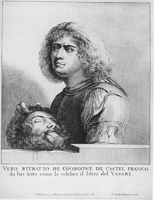 In this print after a lost but famous painting by Giorgione, a founding father of the High Renaissance portrayed himself in armor as the victorious David who had just cut off the head of Goliath. To find out what this means one must identify the discrepancies with the story of David and Goliath. Edgar Wind pointed out in the 1960’s that Giorgione had made the giant’s head no larger than his own as David, a clear discrepancy. He surmised that the artist was presenting himself as a creative giant because the artist’s professional name was ‘Big George’, Giorgione in Italian (fig. 1).{ref1} He was right but there is also a second play on words. In the pictorial language explained here, Giorgione as David has killed Goliath and now presents his "mind" or literally "head" as an example of his painting. Goliath's head is David's capolavoro or "head-thoughts" and the ability of the young Giorgione to compose and paint Goliath’s head is metaphorically compared to the young David’s heroic efforts.{ref2}