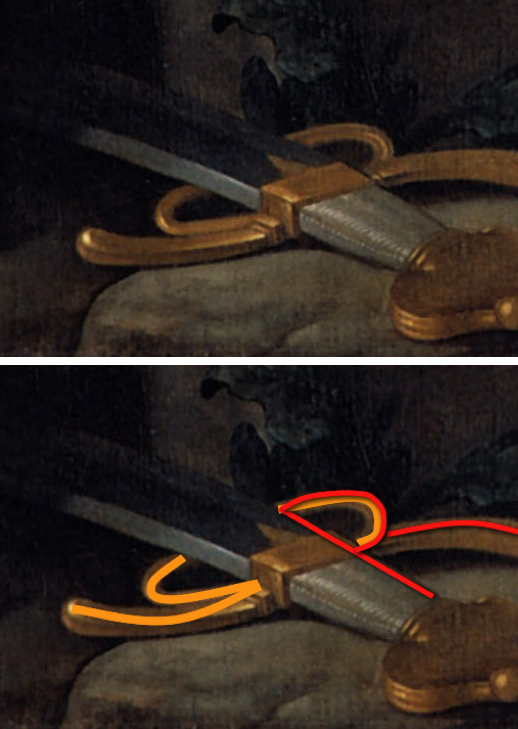 Top: Detail of the sword in Guido Reni's David with the Head of Goliath