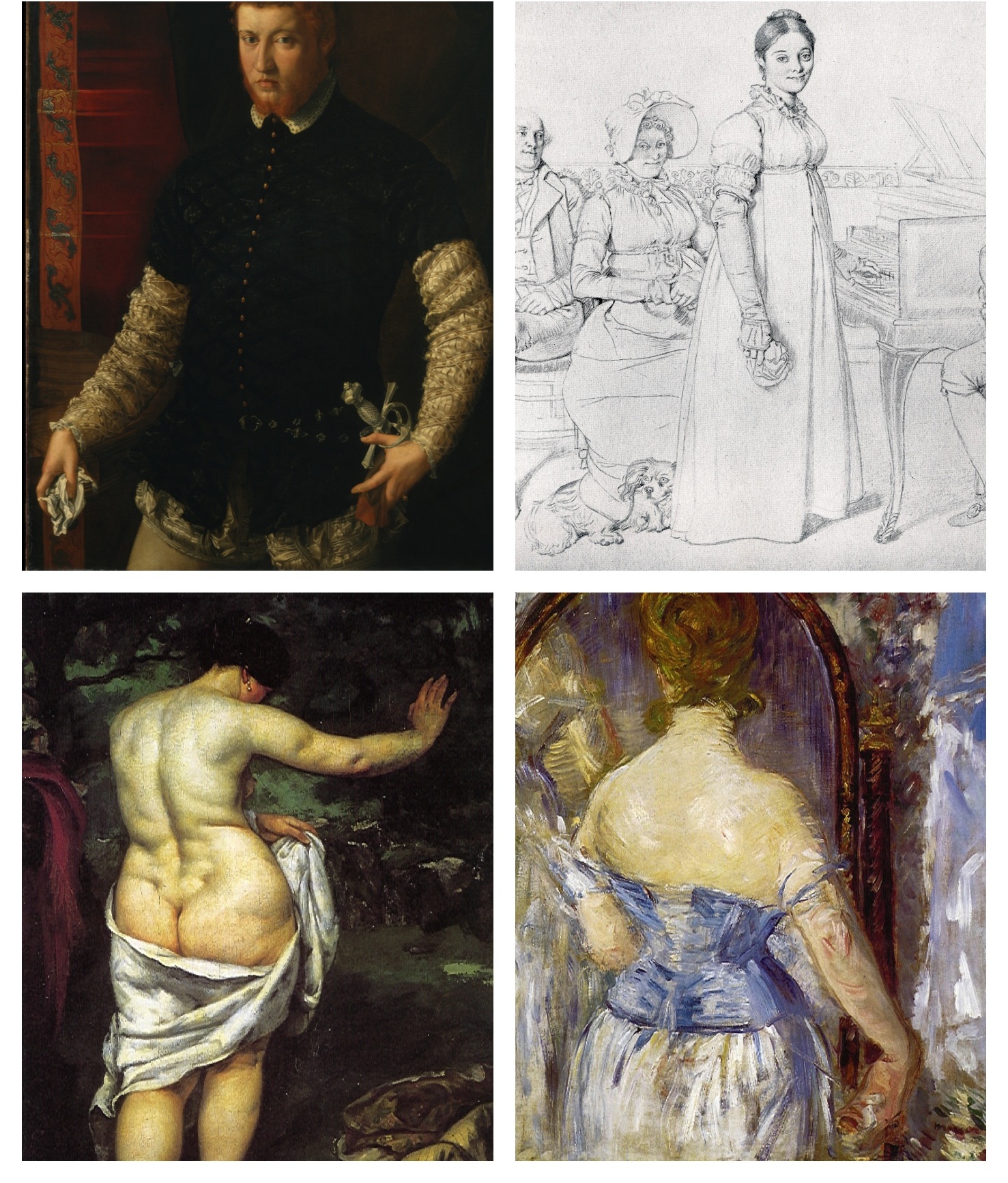 Julie Forestier (Ingres' fiancé, top right) was an artist herself and the shading under her cloth and arm implies their positioning above the drawing's surface. The arm is "creating" the drawing itself. I have shown separately how Courbet's bather (lower left) and Manet's woman (lower right) are artists too.{ref2} In Courbet's the cloth is a white towel but with a corner held in front of the woman as a cloth is held by a painter.