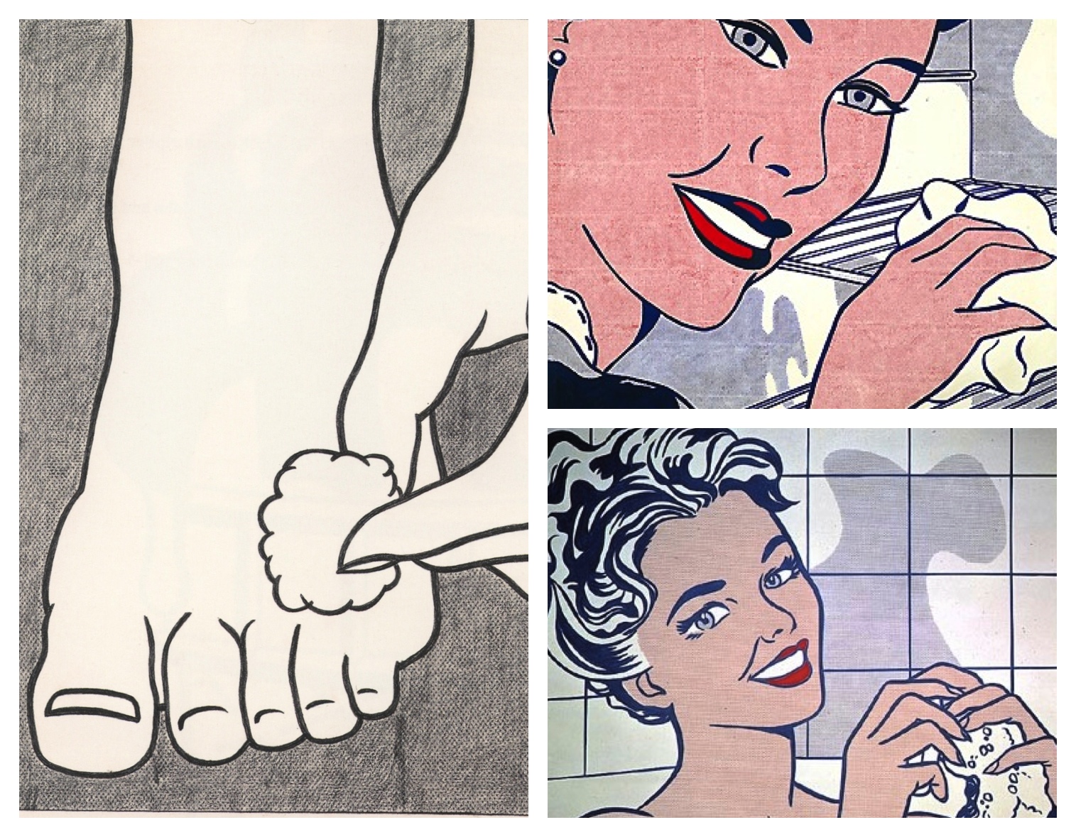 Lichtenstein, the Pop artist, was clearly aware of how cloths, sponges and cleaning had been used in art. So he searched for images which he could turn into scenes of his androgynous mind at work: settings in which he appeared as a woman (both model and artist) painting. His woman cleaning the refigerator (top right) appears to "draw lines" as artists do. In the Bath scene, lower right, the tiled wall is "squared-up" like a prepared canvas while also looking natural in a bathroom. The shadow on the wall, incidentally, is shaped like a lower-case r for Roy while the linear borders of adjacent tiles form multiple L-shapes for Lichtenstein. The women then, like the hand in Foot Medication (left) applying some lotion to a foot, are yet another alter ego of Lichtenstein.