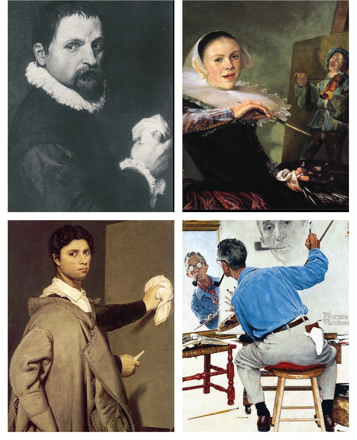 The most overlooked and little-known tool used by painters is the white cloth with which they wipe paint off canvas, smudge it in, or rub it on. Here (clockwise from top left) you can see a cloth in use by four different artists: Francesco Salviati (1510-1563), Judith Leyster (1609-1660), J-D. Ingres (1780-1867) and Norman Rockwell (1894-1978) who has it at hand in his back-pocket.{ref1}