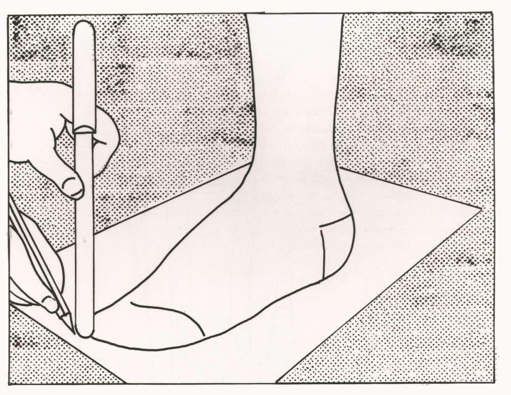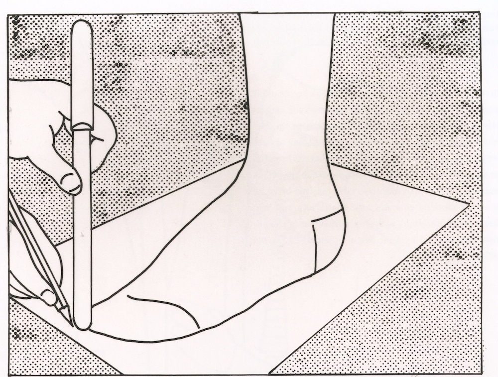 The source shows a foot being traced on a piece of paper using a pencil and knife with instructions on how to do it underneath.