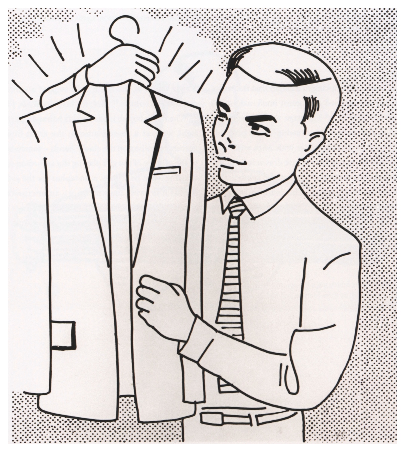 Lichtenstein's man must therefore be the "artist"; his coat is his "painting". He may even have recalled how paint can be applied "in coats".{ref1} The wire hook, resembling a halo, when combined with the lines of radiance from the coat, suggest the artist's divinity and purity of mind, the result of Lichtenstein's clever use of a 1950's advertising symbol for cleanliness: radiating lines, which are themselves a draughtsman's stock-in-trade.