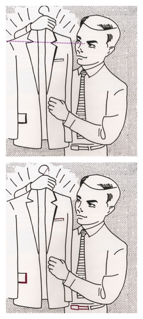 Top and Bottom: Two diagrams of Lichtenstein's Man with a Coat, one identifies the L's in the lapels reflected (top), the other additional L-shapes and phallic-brush-shape in belt buckle (bottom).