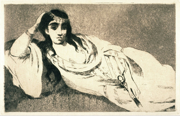 This pattern of the artist imagining the painting of a reclining model goes back to the Renaissance and was later used by Manet in his print known as The Odalisque. Here the reclining model clearly represents both artist and model because she holds a phallic fly-whisk resembling, at its other end, a paintbrush. In Olympia Part I you can see later examples by Cézanne, Gauguin and Picasso.