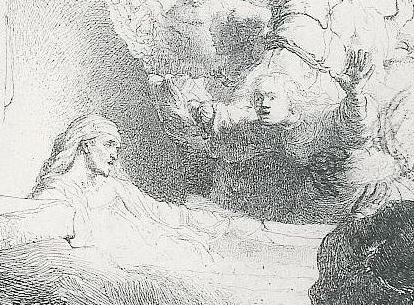 This print by Rembrandt (detail at left), though of different subject matter superficially, is similar in form. It illustrates the biblical story of Christ raising Lazarus from the dead. Beyond the reclining corpse Lazarus' wife watches in amazement. This wife, though, has Rembrandt's features thereby suggesting that with his magical hands, outstretched, the "artist" aids the Christ within his own androgynous mind in bringing this figure to life. As a great artist, Rembrandt continually repeated Christ's miracle.