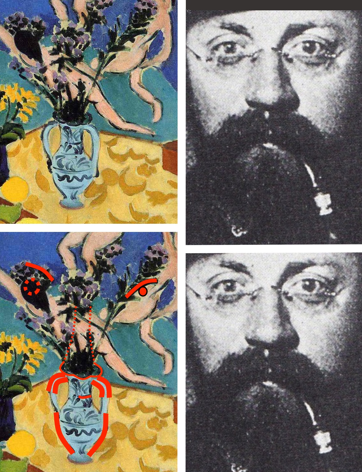 To date I have shown how Matisse's self-portrait is hidden in six works; this one is no exception. First compare the diagram below to the contemporaneous photograph on the right and you should see the tip of his nose and nostrils in the top of the vase, the curve of his moustache in its handles and his eyes and eyebrows in the flowers. His eye on the left is actually the black hair of the dancer in the painting behind. However, within its quote from the Sistine Chapel, she is Michelangelo's God which means Matisse's eye is both divine and, in some sense, Michelangelo's too, one artist's eye as another. Besides, I will soon show in its own entry that the drop-shaped hair of the dancer symbolizes a paintbrush. As Matisse's "eye" though, being solid black, it suggests darkness. In contrast the other pupil is only a small dot. Thus, as so often, one eye of the artist is open for exterior perception, the other closed for insight.