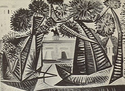 If you are familiar with the work of Picasso’s favorite artists, you may recognize in the arch of foliage the elaborate floral headdress of Velazquez’s Spanish Queen, Maria Theresa. What, though, does Picasso mean? If, as is always the case, we are looking into the artist's imagination then the plants in the townscape are fused with the queen's headdress to suggest the fertility of Picasso's royal and androgynous mind.