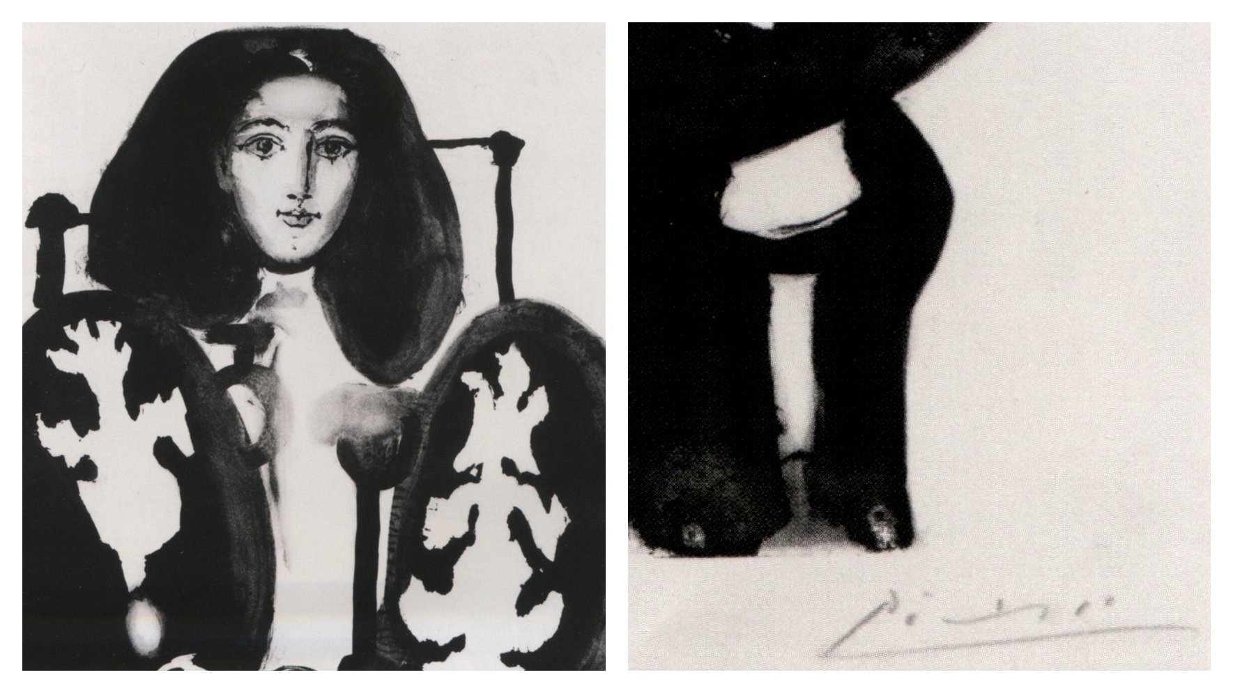 Note too how the chair-back is framed by two Ps for Pablo Picasso, like that in his signature (right).{ref1} Gilot looks royal, fertile and androgynous, a modern goddess whose throne becomes Picasso's "canvas". She is a fusion of two scenes: that of the artist in front of the "canvas" with the picture itself as seen in Picasso's mind on its conception.