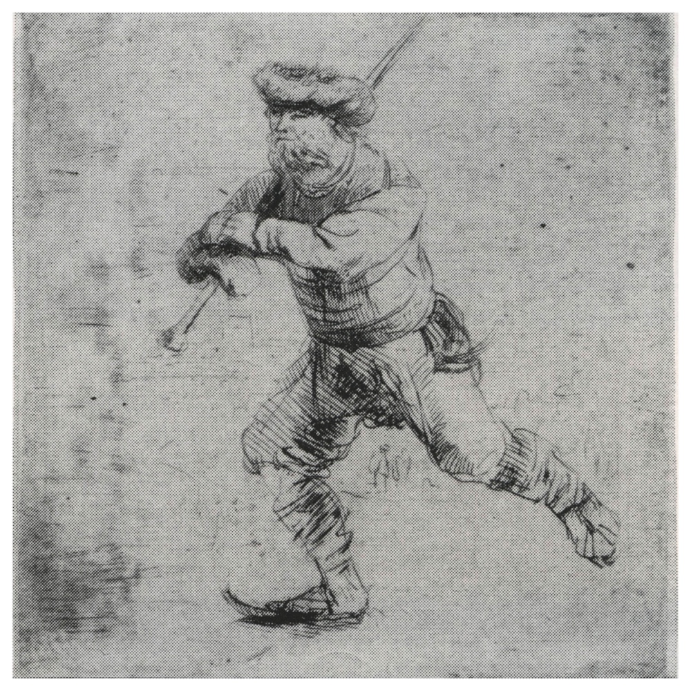The skater, to summarize, is an artist moving across the surface of his own psyche etching the lines we look at. The artist's mind is a crucial feature in art because the search for self-knowledge in all major religious traditions is the search for truth. It is the common element of philosophy. The Skater, as an image, is conceived by Rembrandt out of whose veiled face the skater appears fully formed. It is, as I showed in his other contemporaneous etching, A Beggar in a High Cap, a mental image of the very moment at which Rembrandt the artist imagined this print.