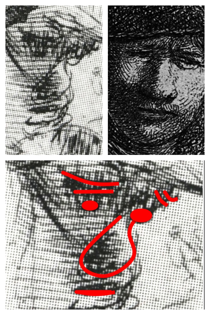 Top R: Detail of Rembrandt's Self-portrait in a Fur Cap (1631) Etching.