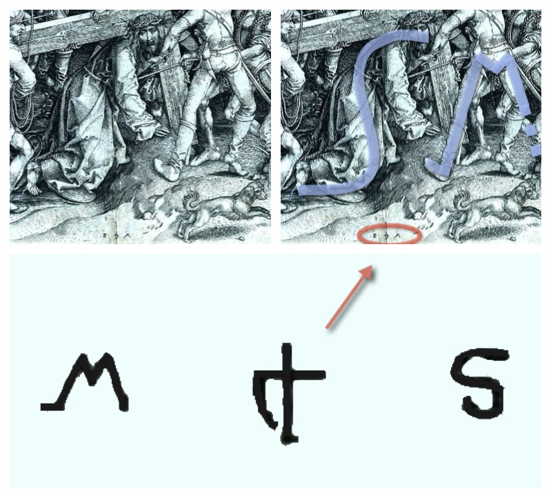 With the detail flipped (upper images), the legs and pelvis of the man can be seen to form an M like that in the monogram (below). His legs and even his foot are suggested in the letter's uprights, a technique Dürer also used.{ref5} Christ, on the other hand, is S-shaped like the artist's other initial. Schongauer is both Christ and his tormentors. Subject and object, artists and artwork, have become one. In esoteric Christianity Satan does not exist because evil represents the chaos inside us. Without chaos there could be no imagination. Besides, in God, all opposites are united.