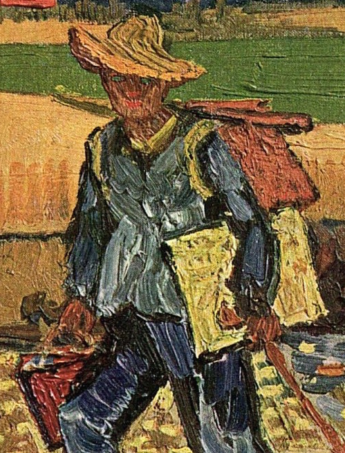 Van Gogh's focus on creative imagination in this painting is further emphasized by the inaccurate color of his eyes: bright green blanks. Green, of course, is the color of fertility (here, mental) and as he walks along the path of life carrying his own tools, his figure suggests that we all "paint" our own lives and that to live a better, happier one, we need the right tools and the creativity to imagine it. Imagination itself is a tool which helps explain why art's meaning is so heavily focused on artists painting themselves. We can all turn ourselves into a masterpiece.