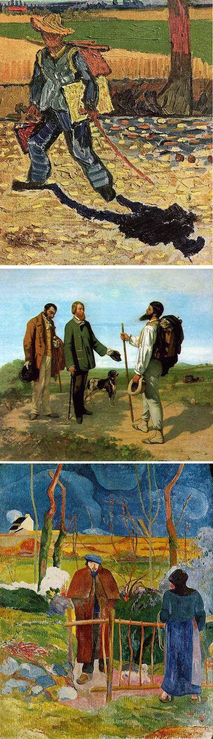 Thirty years earlier Courbet had painted himself on a journey meeting his patron, widely acknowledged as a scene about art (center). In 1889, a year or less after Van Gogh's example, his friend Gauguin openly reimagined Courbet's scene with a similarly-titled painting (bottom). They are worth comparing to the Van Gogh. A distinctive feature of Van Gogh's composition (top) is that his shadow with a long leg seems more dynamic than his own figure. His stick, a natural visual analogue for his paintbrush, points to the shadow and thus "paints" it. Shadows, again as in literature, often symbolize the dark side of the soul as the inner, sometimes chaotic, source of creativity. However, when contrasted with light, the two together can potentially, and additionally, convey the duality of man's physical existence versus the unity of the spirit.