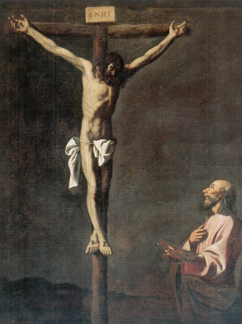 St. Luke was the patron saint of painters based on a legend that he had drawn the Virgin's portrait from life. In this unusual painting, however, Zurburan portrays himself as St. Luke painting "The Crucifixion". The Prado curators seem unaware of this, remarking only that Luke lacks "the religious fervor expected of a saint." Here's why. They think he stands as a saint in front of the Crucifixion and not in front of his own painting. It is a crucial difference. While it is perhaps more correct to state that, as an image in the artist's mind, Zurburan has fused two realities (that of the studio and that of his painting) the meaning is similar: Zurburan has painted The Crucifixion. His hand gesturing towards his own body even indicates this, conveying that what appears to be external is internal. Remember this when you next look at a Crucifixion by a great master: you'll be surprised.