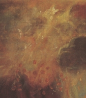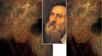I've found a clearer image of Titian's own face, a previously unseen self-portrait, made from the clouds in his Prado Danae. You can see the tip of his nose in the center of this image, his far eye quite clearly indicated above it and sl