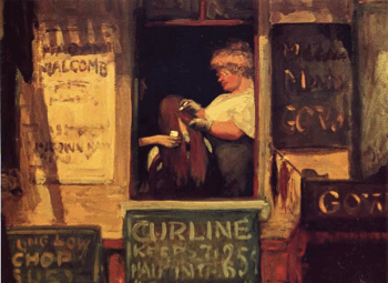 This month’s Art Bulletin, the magazine of the U.S. College Art Association, is a bumper issue as far as we are all concerned. One article by Michael Lobel reveals how John Sloan, a member of the Ashcan School in early twentieth-century America, posed figures in his street scenes as artists “painting” the scene and on one occasion even presented himself as a female hairdresser “painting” a client’s hair (above). Part of his proof is that Sloan, rail-thin, fused some of his own features into the face of the plump hairdresser! Lobel also demonstrates that Sloan suggests “paintbrushes” and “palettes” through objects with a similar shape.
