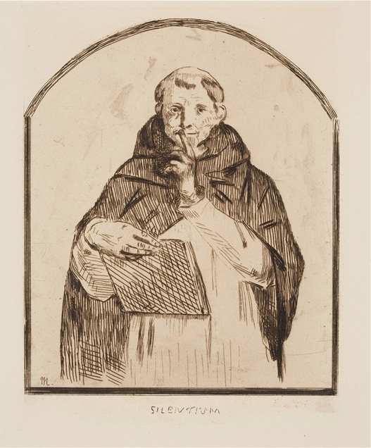 Great poets are great poets because they have reached heights of spiritual understanding inaccessible to the crowd. The starting-point depends on the individual; some are born prophetic, others somewhere along the way. Those who begin at the bottom, so to speak, are the vast majority of adepts – like you or me, perhaps - but even they represent a tiny percentage of mankind. The rest (99.99%) never even imagine that material reality might be an illusion and that truth must be sought inside. What many of the paths have in common, though, is a warning from one master or another that knowledge of the paths are dangerous to those unequipped and unprepared to hear them. The teachings include within the Christian tradition, for instance, the dawning realization that you can become Christ, that Christ is you. Clearly this is so at odds with church-going Christianity that knowledge of it can be extremely dangerous. The Church fathers and the saints knew that; most priests today probably do not. In the wrong ears, say a young Adolph Hitler’s, the results could be calamitous. Edouard Manet was so aware of this that he etched Fra Angelico’s warning to the monks of the monastery of San Marco, Silentium (above). The message is both silence and secrecy.