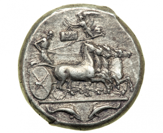 Coins draw groans. Walk into a roomful of coins in a museum and even the most ardent art lovers hurry through in the hope of finding some painting or sculpture on the other side. Nevertheless the designs on coins are one of the glories of Greek art in antiquity. Talented artists designed the dies, the best of whom sometimes left their name or mark on the work. One such example from Syracuse in Sicily, dated c.410 BC, is signed unusually on both sides by two different artists. Euainetos designed and then signed the obverse of this coin, Eumenos did the same on the reverse. The image above, the side that caught my attention, is by Euainetos. His scene is divided into two parts, above and below the horizontal line. We are interested in the scene above. A one-man chariot drawn by four horses, known as a quadriga, gallops towards the right while Nike, goddess of victory, flies in the opposite direction holding a tablet. Although it is a very familiar scene in Greek numismatics with numerous variations, Euainetos brought a dynamism and sensitivity to the motif that cannot be found in the work of lesser artists. Traditionally in such scenes Nike flies in holding a laurel wreath to crown either the rider as the victor or the horses. In Euainetos' example she holds a tablet instead with Euainetos' own name on it as though she were coming to crown the artist.