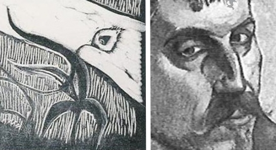 Gauguin did just that when he portrayed his face in a plant (above left) in Nave Nave Fenua (1893-4) but he's just one of many. Dozens of other artists have too. You can find many such examples under the theme Veiled Faces. So, remember, if you're searching for a veiled self-portrait in art, you are only on the lookout for one or two features. An eye and nose perhaps; or a moustache as here. Once you get the hang of looking for them, you'll see them everywhere. Practice, as they say, makes perfect.