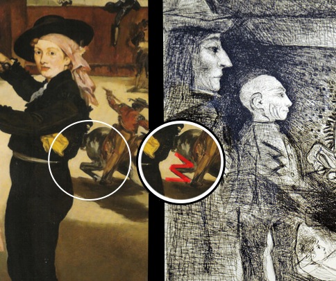 Diagram of two details from Manet's Mlle. V...in the Costume of an Espada (1862) on the left and Picasso's Self-portrait and Circus Figures (1968) on the right.
