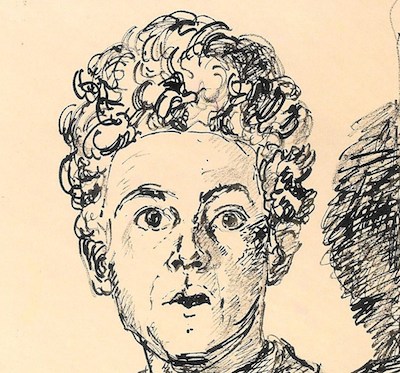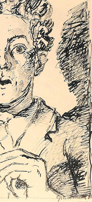 The shadow, then, is in front of Giacometti, drawn on the glass. This is supported by how his pen’s motion, sweeping back-and-forth across the shadow’s head, does not stop at the shoulder but continues with the same pattern in front of it, at least near the edge and, again perhaps, in a dark area of scribble just below his armpit. Both areas seem to be shadows on his jacket but they can be read both ways.