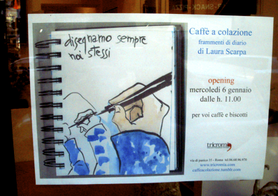I have been arguing for years that the concept every painter paints himself is alive and well in the art world, even if art scholars are unaware of it. So I was particularly delighted when I came across this notice posted on the window of an art gallery in Rome in January 2010. It was an invitation to a Gallery Opening and was possibly drawn by the artist herself, Laura Scarpa. On it, the artist has drawn her hand drawing her own hand with the title in Italian as close to every painter paints himself as you can get: “Disegnamo sempre noi stessi” or, in English, “We always draw ourselves”.